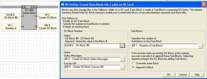 SD Data Blocks may reach a total of 4G, or a single Block may be up to 4G. A Data Block comprises Sub-Blocks of 512 Bytes. The SD Block functions enable you to read/write blocks of raw data between operands and these files.