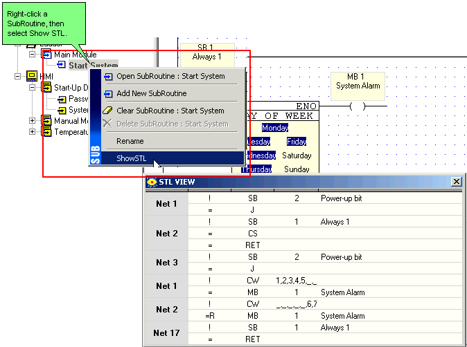 You can view STL code for a particular Subroutine, whether off-line or in Online Test mode.