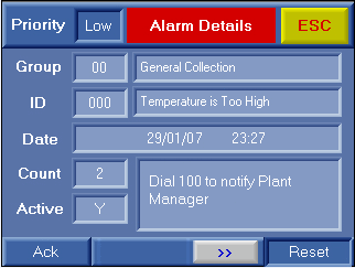 While the Alarms displays are on the screen, the PLC application continues to run. This includes both the Ladder, including subroutines, and the HMI application. This means that the current HMI display, the one on the screen when the PLC enters Alarms, may not be the same one displayed when the PLC exits Alarms. |