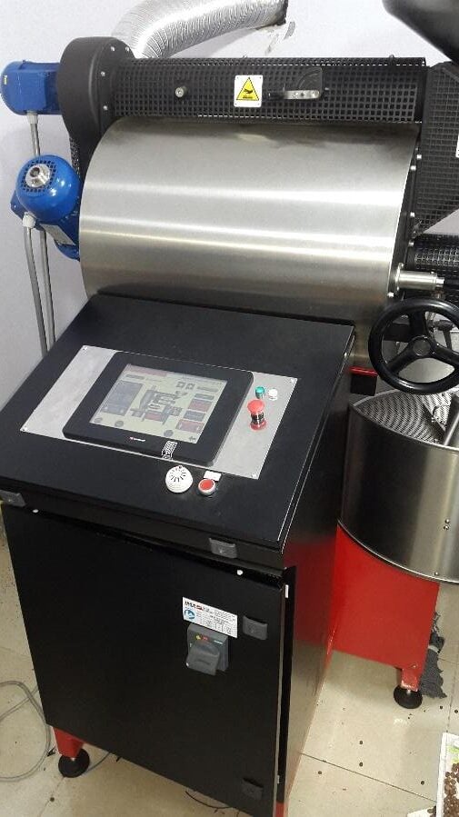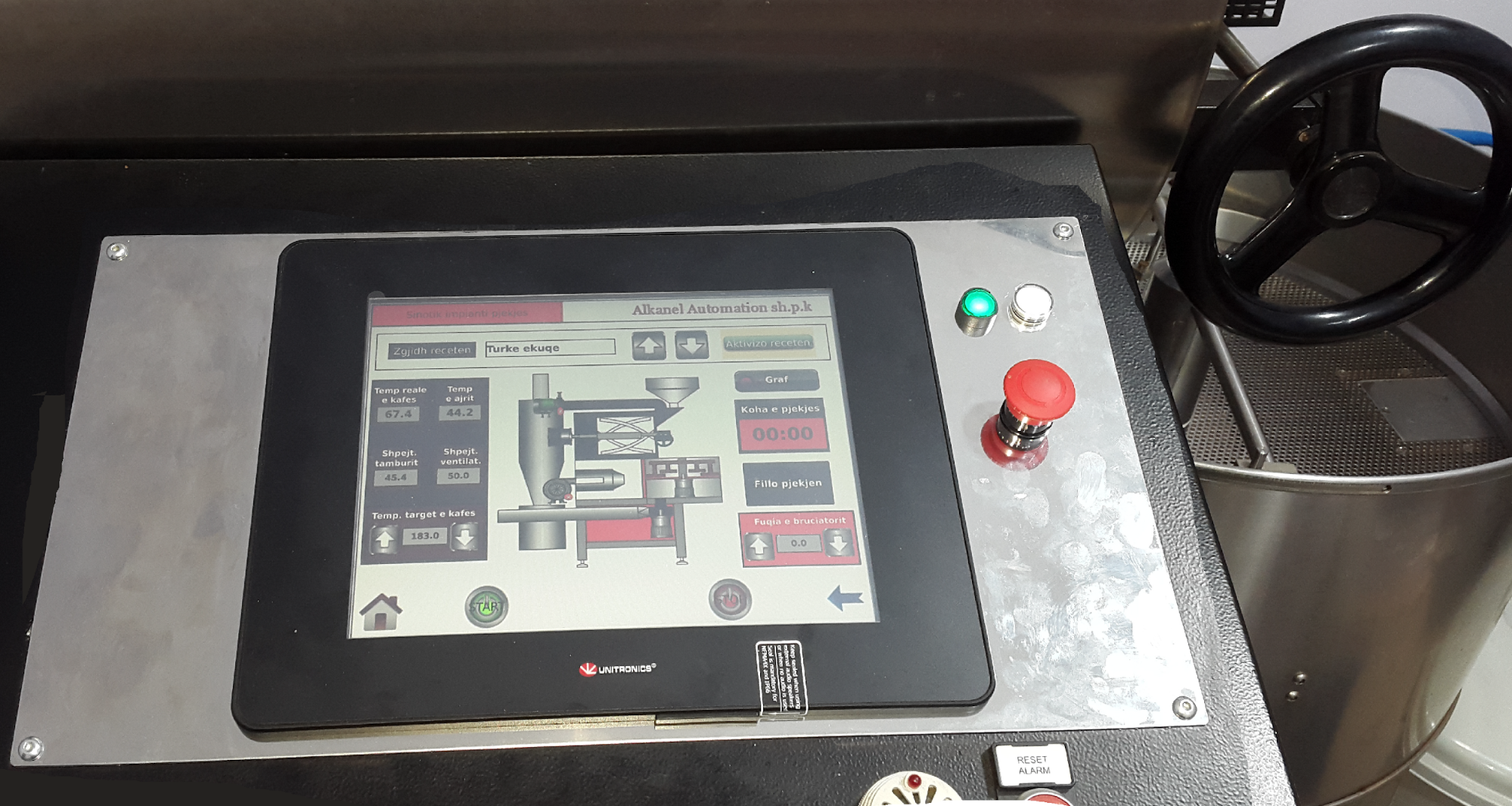 Using Unitronics UniStream PLC + HMI and VFDs Alkanel can control 6 temperature targets of coffee beans within a 16-minute roasting process, including gas burner output power, combustion chamber temperature, hot air flow, drum RPM, drum discharging, and coffee bean cooling.
